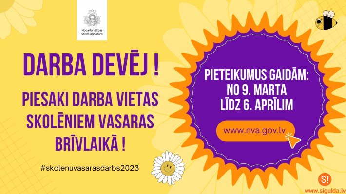 Nodarbinātības valsts aģentūras (NVA) filiāles visā Latvijā līdz 6. aprīlim pieņem darba devēju pieteikumus skolēnu nodarbinātības pasākuma īstenošanai 2023. gada vasarā.