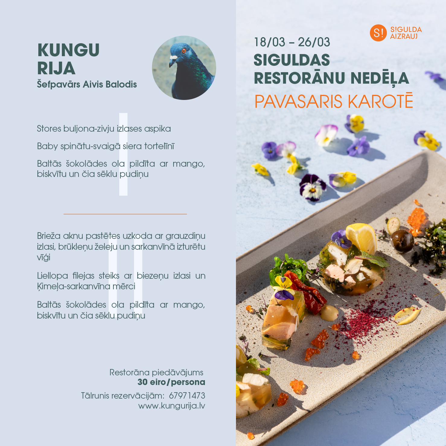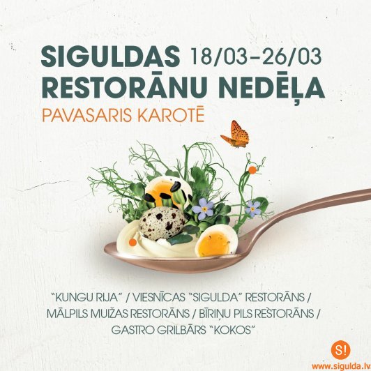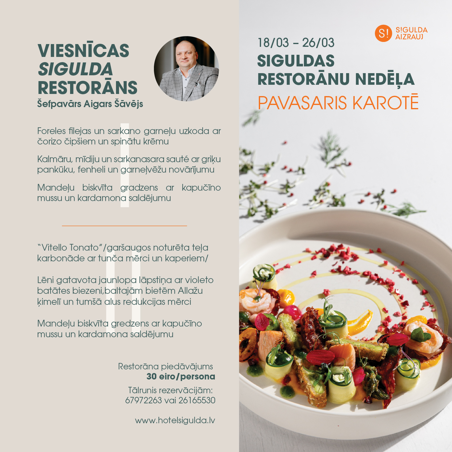 Līdz 26. martam Siguldas novadā norisināsies Pavasara Restorānu nedēļa, kuras laikā vairākos novada un tā apkārtnes restorānos būs iespēja baudīt svaigas, pavasarīgas un garšām bagātas trīs ēdienu maltītes 30 eiro vērtībā. Šā gada tēma “Pavasaris karotē” izaicina šefpavārus radīt pavasara garšu eksploziju katrā kumosā!