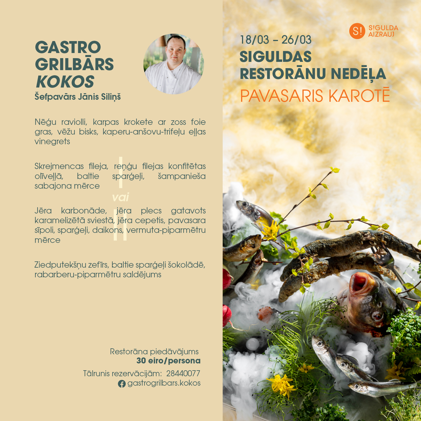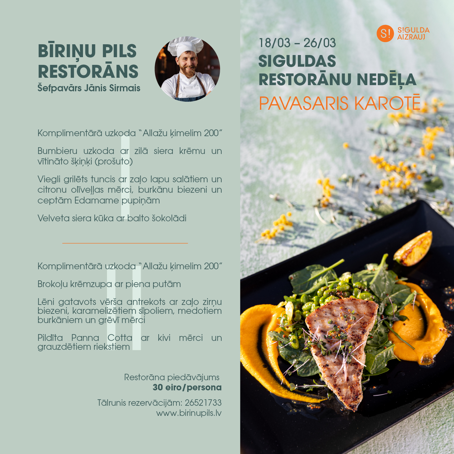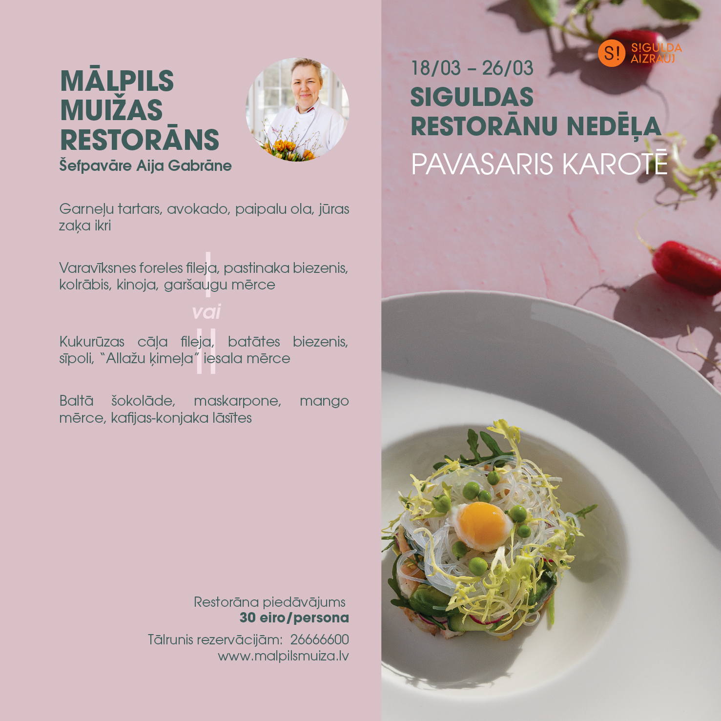 Līdz 26. martam Siguldas novadā norisināsies Pavasara Restorānu nedēļa, kuras laikā vairākos novada un tā apkārtnes restorānos būs iespēja baudīt svaigas, pavasarīgas un garšām bagātas trīs ēdienu maltītes 30 eiro vērtībā. Šā gada tēma “Pavasaris karotē” izaicina šefpavārus radīt pavasara garšu eksploziju katrā kumosā!