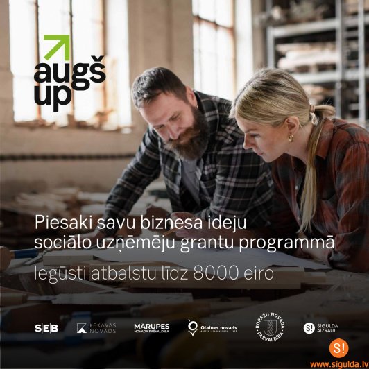 3. aprīlī tiek uzsākta projektu pieņemšana sociālās uzņēmējdarbības grantu programmai “Augšup”, ko Siguldas novads īsteno kopā ar SEB banka, kā arī Ķekavas, Mārupes, Olaines, Ropažu novadu. Pretendēt uz finansiālo atbalstu varēs gan strādājoši uzņēmumi, gan vēl neīstenotu biznesa ideju autori.Sociālās uzņēmējdarbības grantu programmā “Augšup” kopējais pieejams atbalsts būs līdz 48 000 eiro