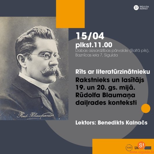 15. aprīlī plkst. 11.00 Dabas aizsardzības pārvaldes ēkā (Baltajā pilī) Siguldā, Baznīcas ielā 7, notiks cikla “Rīts ar literatūrzinātnieku” aprīļa tikšanās. Dzirdēsim literatūrzinātnieka Benedikta Kalnača stāstījumu “Rakstnieks un lasītājs 19. un 20. gadsimta mijā. Rūdolfa Blaumaņa daiļrades konteksti”. Pasākumu iespējams apmeklēt gan klātienē, gan skatīties tiešraidē kultūras centra “Siguldas devons” Facebook lapā.