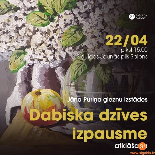 Sestdien, 22. aprīlī, plkst. 15.00 Siguldas Jaunās pils salonā mākslinieks Jānis Puriņš aicina uz savas jaunākās personālizstādes “Dabiska dzīves izpausme” atklāšanu. Izstādes atklāšanā ieeja pilī ir bez maksas.