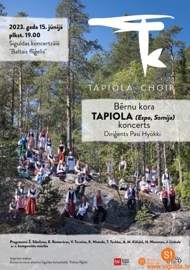 15. jūnijā plkst. 19.00 koncertzālē “Baltais flīģelis” koncertu sniegs starptautiski atzītais bērnu koris “TAPIOLA” no Somijas pilsētas Espo.