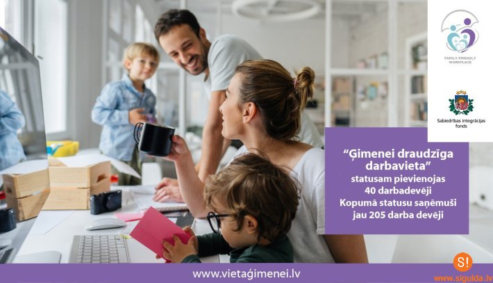 Sabiedrības integrācijas fonda īstenotās programmas “Ģimenei draudzīga darbavieta” statusu ieguvusi Siguldas novada pašvaldības centrālā pārvalde un vēl 39 darba devēji. Programma nodrošina konsultatīvu un informatīvu atbalstu organizācijām, veicinot darba un privātās dzīves līdzsvaru sabiedrībā.