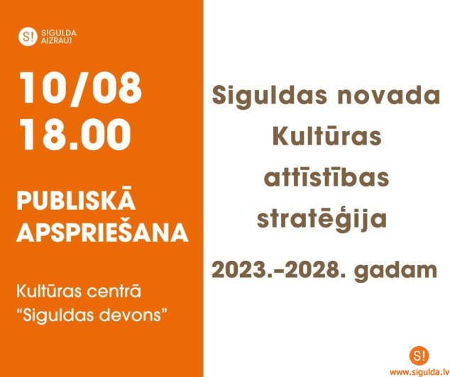 Vienlaikus atgādinām, ka ierosinājumus stratēģijas pilnveidošanai var iesniegt, rakstot uz e-pasta adresi kultura@sigulda.lv vai iesniedzot klātienē – kādā no pašvaldības klientu apkalpošanas centriem.