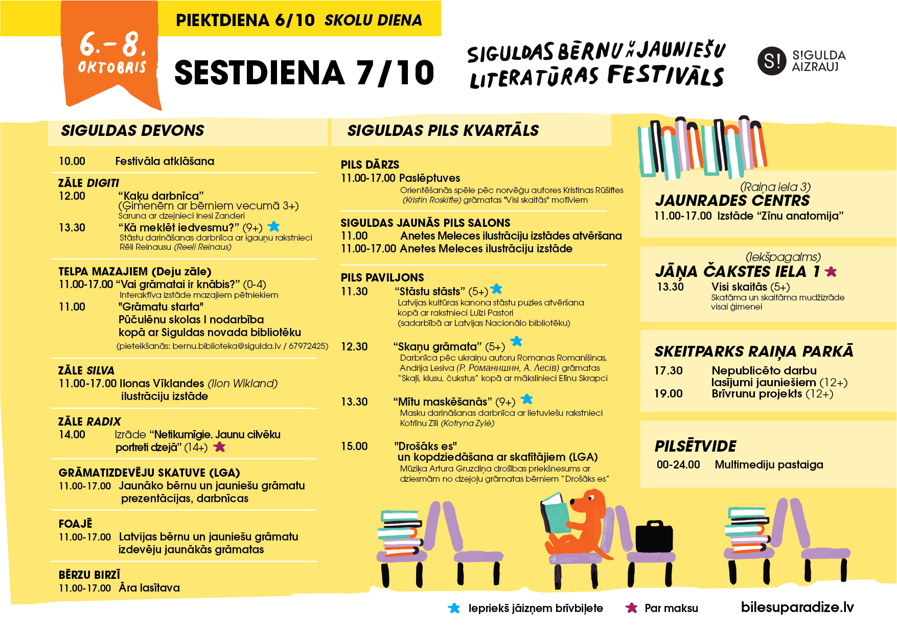 Mazākos lasītājus iepriecinās starptautisku atzinību guvušās mākslinieces Anetes Meleces ilustrāciju izstāde, orientēšanās spēle “Paslēptuves” ar norvēģu autores Kristinas Rūšiftes (Kristin Roskifte) grāmatas “Visi skaitās” tēliem, Latvijas Nacionālās bibliotēkas Atbalsta biedrības izstāde “Vai grāmatai ir knābis?”, bērnu iemīļotā izrāde “Bruņinieks, kuram sāpēja zobi”, Latvijas Nacionālās bibliotēkas stāstu puzles darbnīca ar rakstnieci Luīzi Pastori un citi notikumi.