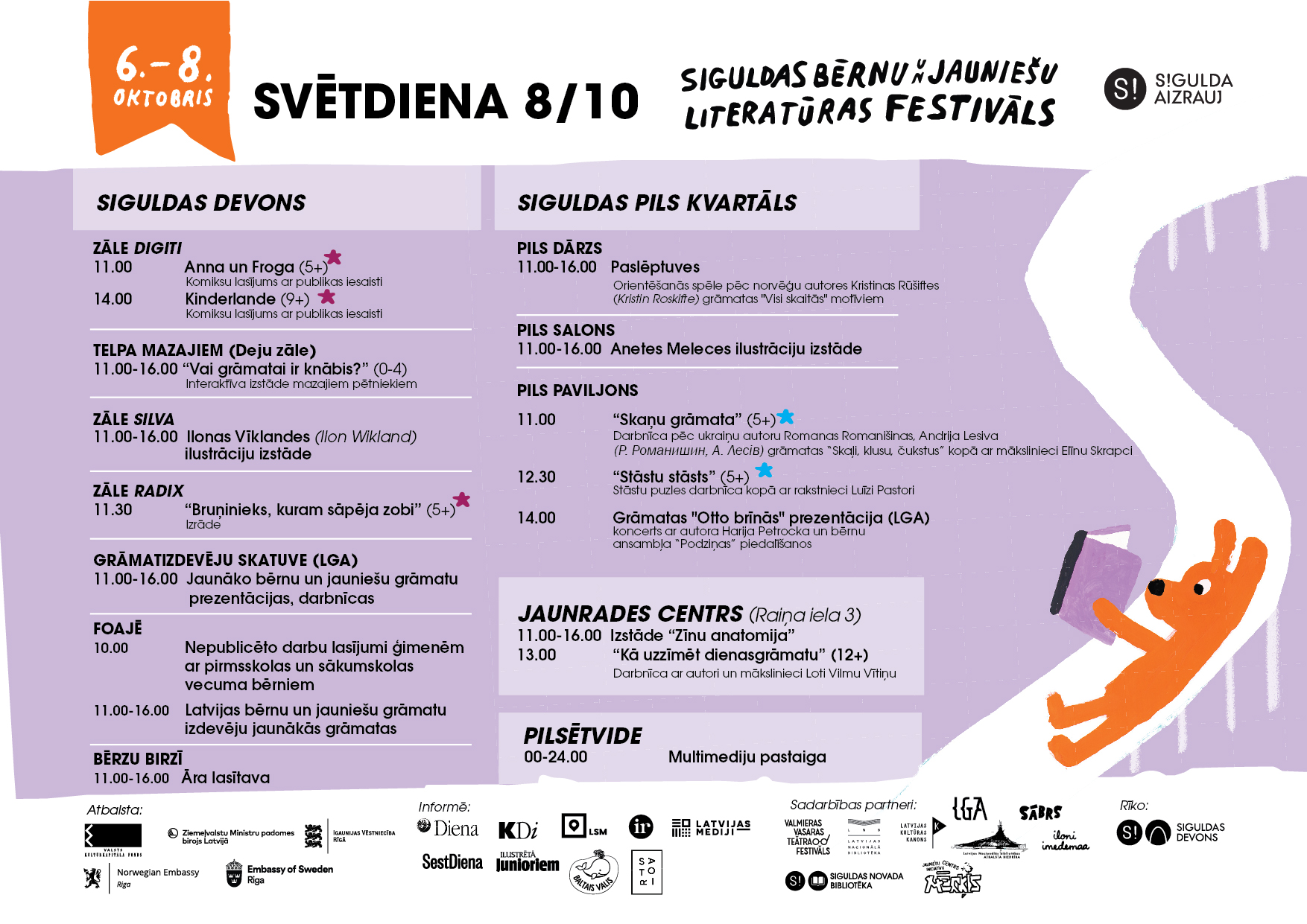 Siguldas bērnu un jauniešu literatūras festivāls notiks no 6. līdz 8. oktobrim. Festivāla daudzveidīgā programma piedāvās tikšanās un darbnīcas ar autoriem un ilustratoriem no Latvijas, Igaunijas, Lietuvas un Norvēģijas, ilustrāciju izstādes, teātra izrādes, multimediju pastaigu un citus notikumus.