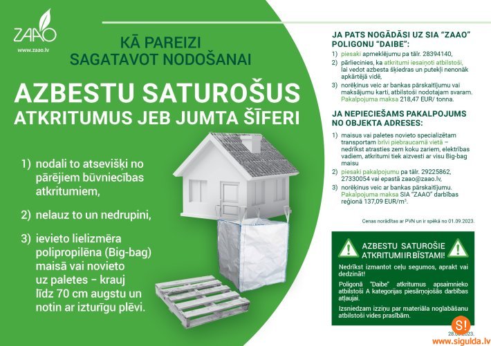 Lēdurgas un Krimuldas pagasta iedzīvotājiem azbestu saturošu atkritumu jeb jumta šīfera nodošana iespējama divos veidos – nogādājot pašiem SIA “ZAAO” poligonā “Daibe” vai piesakot atkritumu savākšanu no objekta (adreses).