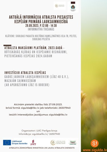 Lai informētu par investīciju atbalsta piesaistes iespējām un dalītos aktuālajā informācijā platību maksājumu pieteikumu būtiskākajās kļūdās, par pieteikumu sagatavošanu jau 2024. gadam, būs iespēja apmeklēt praktisku tikšanos kopā ar Lauku atbalsta dienestu un LLKC konsultantiem. Tā notiks 29. septembrī plkst. 12.00 Siguldas pagasta Kultūras namā (Zinātnes iela 7B, Siguldā).