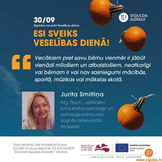30. septembrī norisināsies Siguldas novada Veselības diena, kurā iedzīvotāji varēs apmeklēt dažādas lekcijas un uzzināt noderīgu informāciju. Lektoru vidū būs arī psiholoģe Jurita Smiltiņa, kura interesentiem izklāstīs par bērna veselīgas attīstības priekšnosacījumiem dažādos vecuma posmos, kā atbalstīt, iedrošināt un virzīt bērnu, veidojot pozitīvu pārliecību par sevi un pasauli.