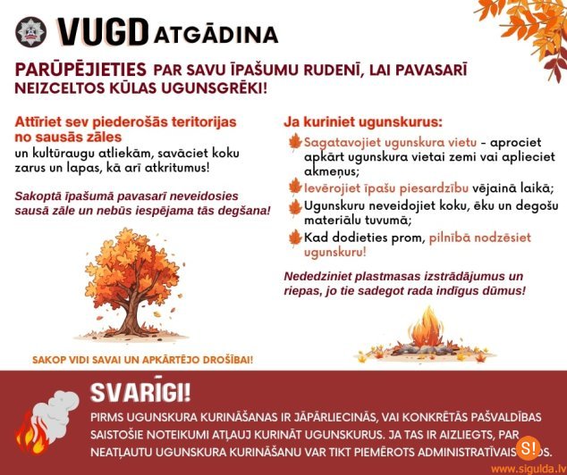 Lai pasargātu sevi, līdzcilvēkus un īpašumus, Valsts ugunsdzēsības un glābšanas dienests (VUGD) aicina iedzīvotājus un pašvaldības vēl šogad attīrīt sev piederošās teritorijas no sausās zāles un kultūraugu atliekām, savākt koku zarus un lapas, kā arī atkritumus, lai pavasarī neizceltos postoši ugunsgrēki.