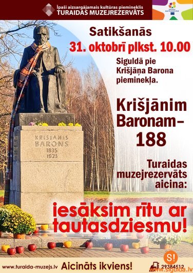 Jau vairākus gadu desmitus Turaidas muzejrezervāta ļaudis Dainu tēva jubilejā aicina visas paaudzes pulcēties pie Krišjāņa Barona pieminekļa Siguldā, lai kopīgi svinētu viņa dzimšanas dienu, daloties ar savām mīļākajām tautasdziesmām, un godinātu viņa ieguldījumu Latvijas kultūras mantojuma saglabāšanā. Turaidas muzejrezervāts aicina pievienoties un uzsākt rītu ar tautasdziesmu 31. oktobrī plkst. 10.00.