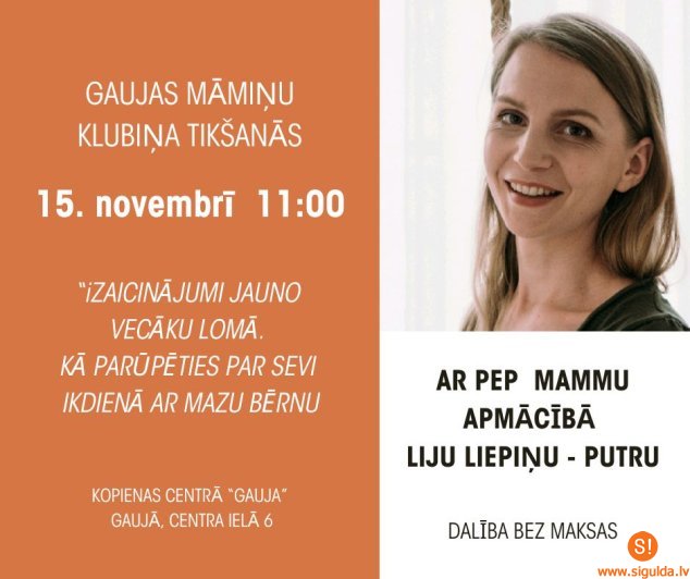 15. novembrī plkst. 11.00 dienas centrā “Gauja”, centra ielā 6, viesosies PEP mamma Lija Liepiņa-Putra, lai emocionāli stiprinātu māmiņas ikdienas gaitā. Lija Liepiņa-Putra runās par ikdienas izaicinājumiem vecāku lomā un sniegs padomus kā mammām ar mazu bērnu rūpēties par sevi ikdienā.