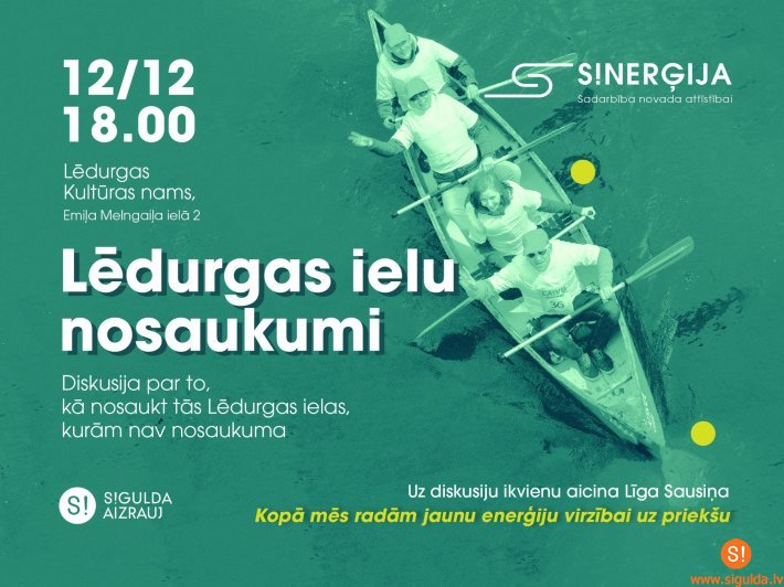 Siguldas novada pašvaldības domes priekšsēdētāja Līga Sausiņa aicina iedzīvotājus, dažādu jomu pārstāvjus un uzņēmējus uz domnīcu cikla “S!nerģija” tikšanos 12. decembrī plkst. 18.00 Lēdurgas Kultūras namā, Emiļa Melngaiļa ielā 2.