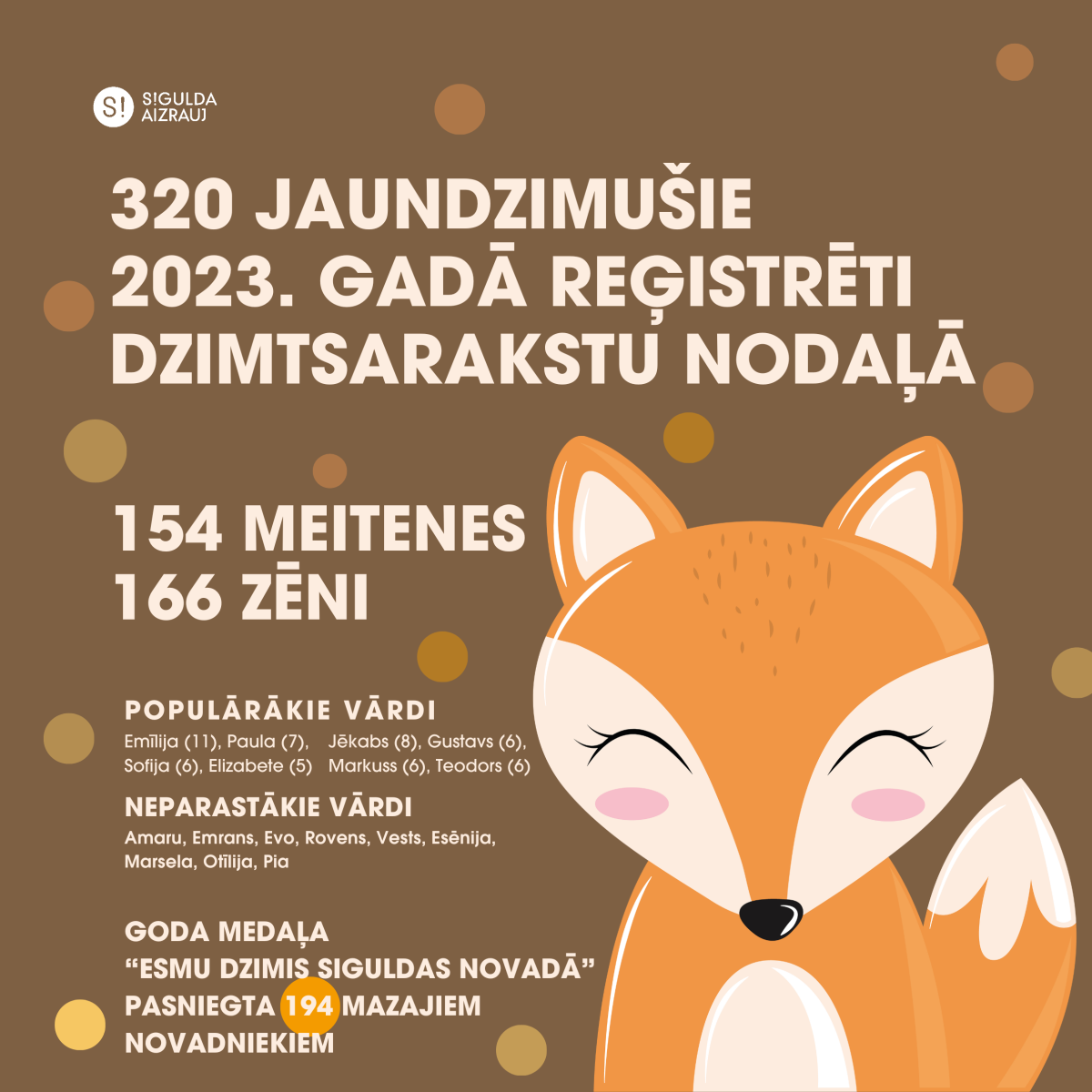 Siguldas slimnīcā 2023. gadā pasaulē nākuši 898 jaundzimušie. Siguldas novada Dzimtsarakstu nodaļā reģistrēto jaundzimušo vidū ir 154 meitenes un 166 ir zēni, divās ģimenēs piedzimuši dvīņu pāri. Divi bērniņi dzimuši Ukrainas pilsoņu ģimenēs un deklarēti Siguldas novadā. No Dzimtsarakstu nodaļā reģistrētajiem 320 jaundzimušajiem 260 ir deklarēti Siguldas novadā. Pirmais bērniņš ir ienācis 115 ģimenēs, otrais - 108, trešais – 74, ceturtais – 16, piektais – 6 un vienā ģimenē ir ienācis septītais bērniņš. Aizvadītā gada populārākie vārdi zēniem bija Jēkabs (8), Gustavs (6), Markuss (6), Teodors (6), savukārt meitenēm – Emīlija (11), Paula (7), Sofija (6), Elizabete (5), bet interesantākie vārdi – Amaru, Emrans, Evo, Rovens, Vests, Esēnija, Marsela, Otīlija, Pia.