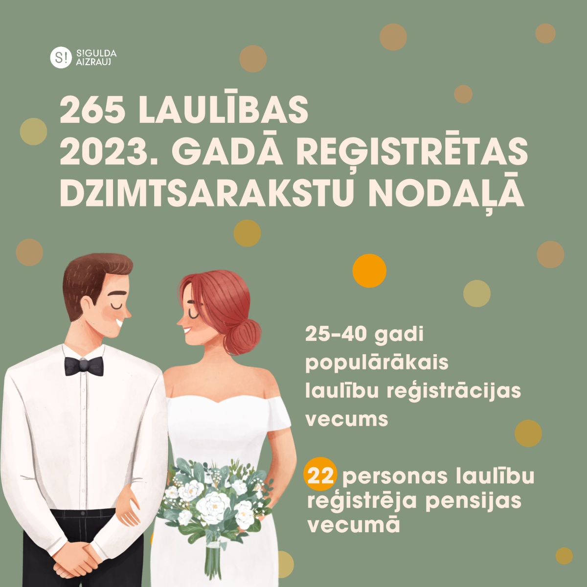 Siguldas novada Dzimtsarakstu nodaļā reģistrētas 265 laulības, no tām 177 pāri ir laulāti Siguldas Jaunās pils telpās, 42 pāri – izbraukuma ceremonijās, kas notikušas novada muižās, viesu namos un Gaujas senielejas gleznainajās vietās. Savukārt 8 pāri “Jā” vārdu izvēlējās teikt Krimuldas pagasta nodaļas telpās un 7 pāri – Mālpils pagastā. Siguldas novada baznīcās gredzenus mijis 31 pāris. Joprojām populārākais laulību noslēgšanas vecums pāriem ir 25–40 gadi. Tomēr pērn Dzimtsarakstu nodaļā salaulātas arī 22 personas pensijas vecumā (vecākais kungs bija 86 gadu vecs un vecākā kundze – 82 gadu vecumā) un 16 ārzemnieki.