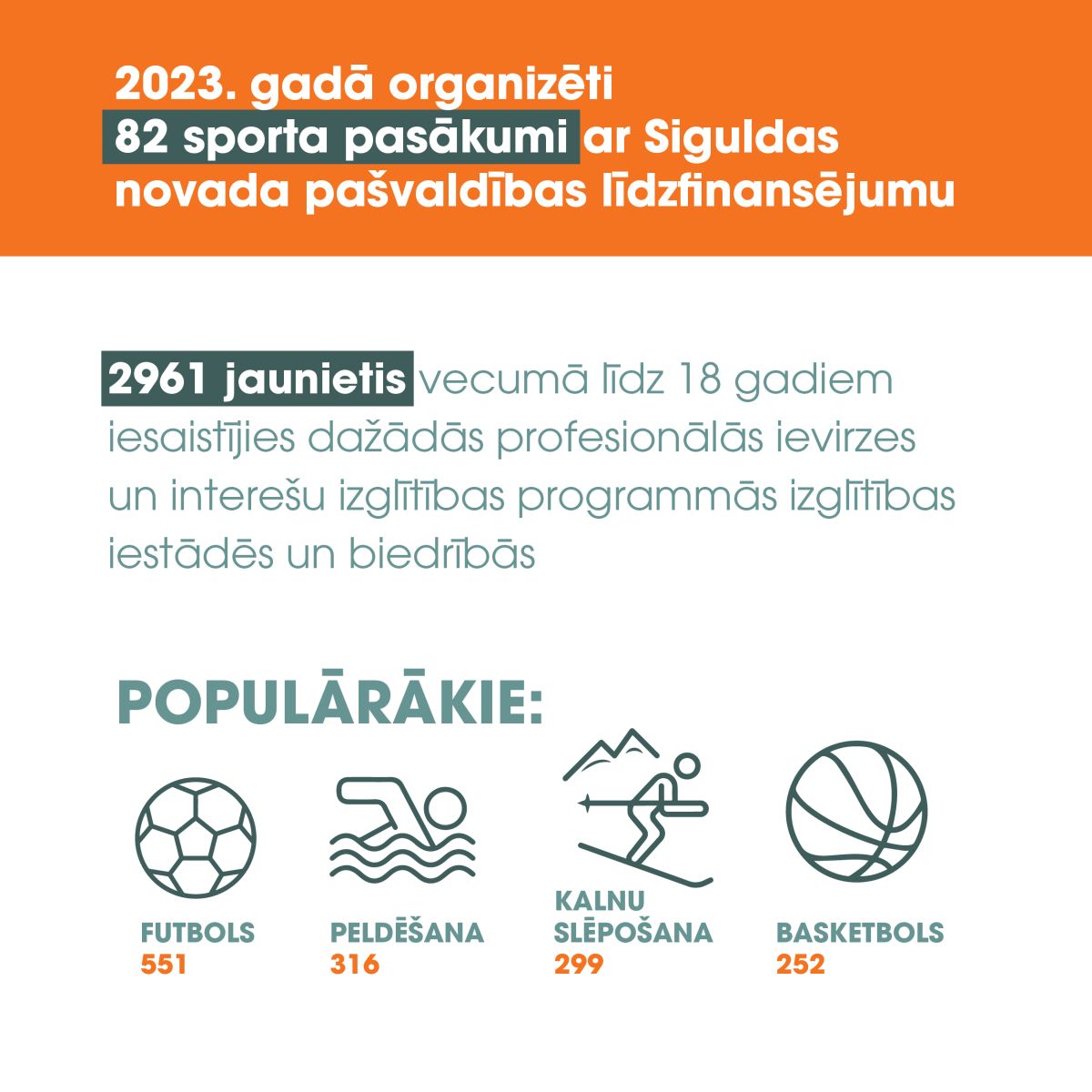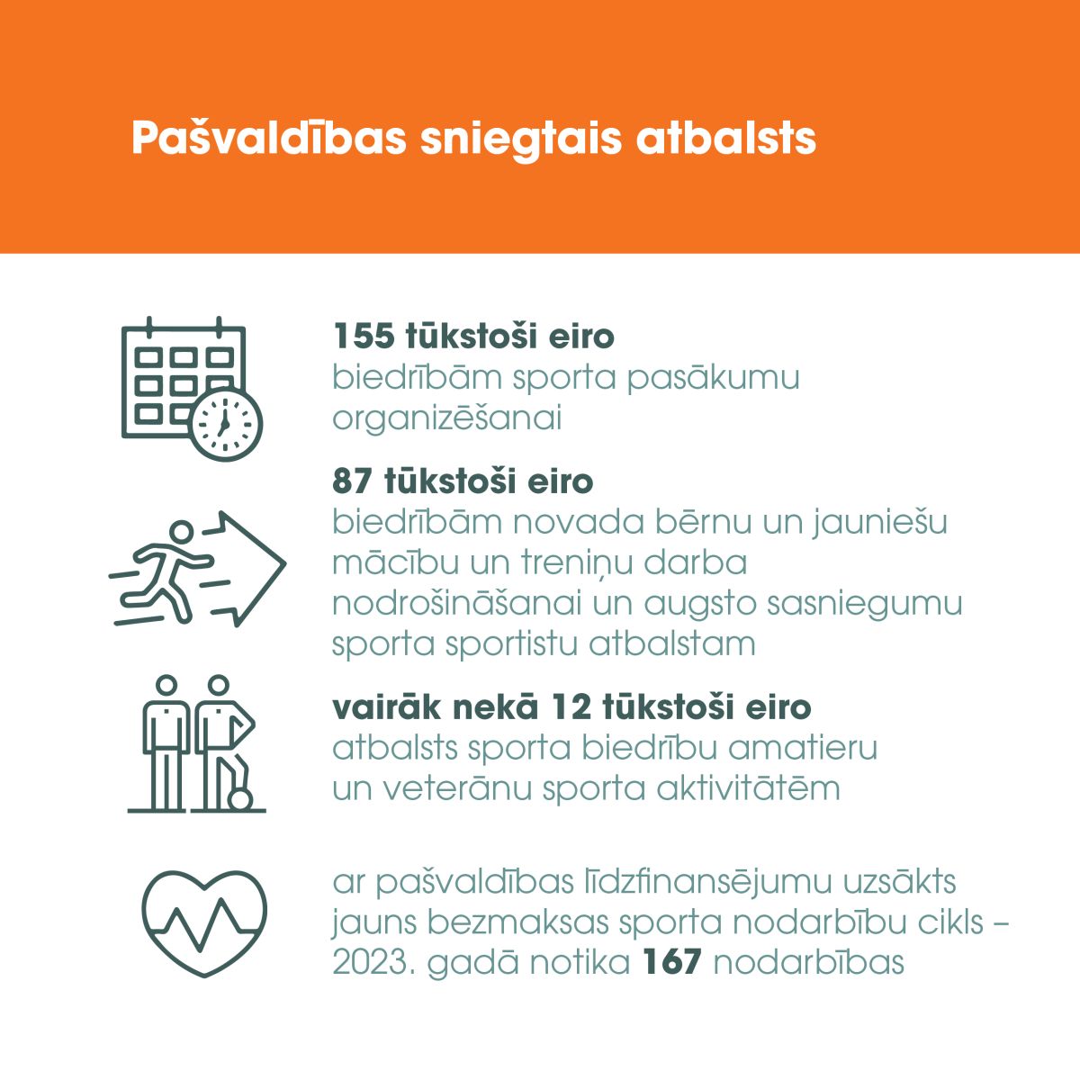 - 1285 iedzīvotāju bezmaksas fizisko aktivitāšu nodarbības dažādos sporta veidos, tai skaitā bērniem un jauniešiem, cilvēkiem ar funkcionāliem traucējumiem, maznodrošinātajiem, un nodarbības pagastos, iesaistot 10 049 dalībniekus;