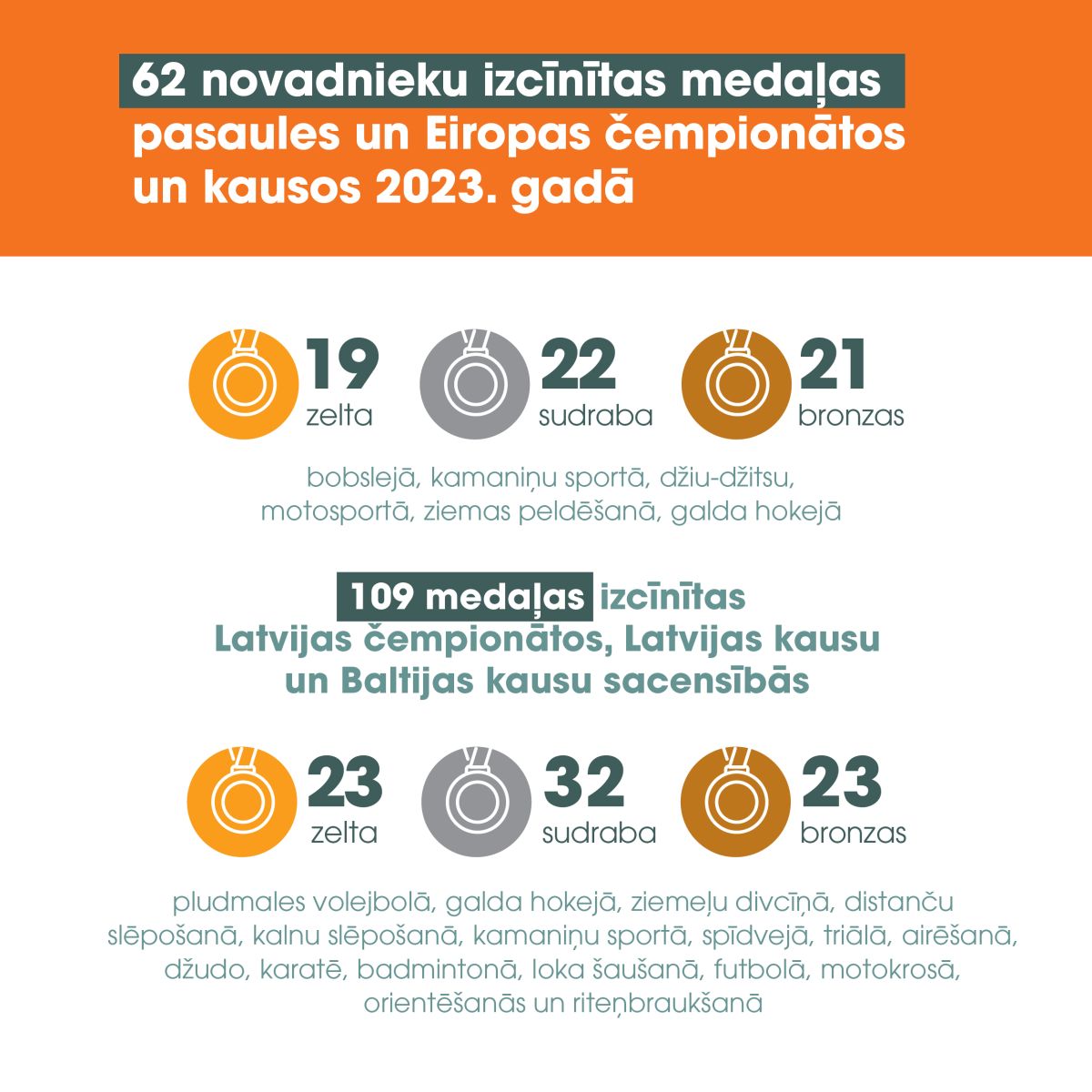 Novadnieki godam nesuši Latvijas vārdu starptautiskajā sporta pasaulē. Kopumā izcīnītas 62 medaļas pasaules un Eiropas čempionātos un kausos, tai skaitā 21 bronzas, 22 sudraba un 19 zelta medaļas, pārstāvot bobsleju, kamaniņu sportu, džiu-džitsu, motosportu, ziemas peldēšanu, galda hokeju pasaules elitē.