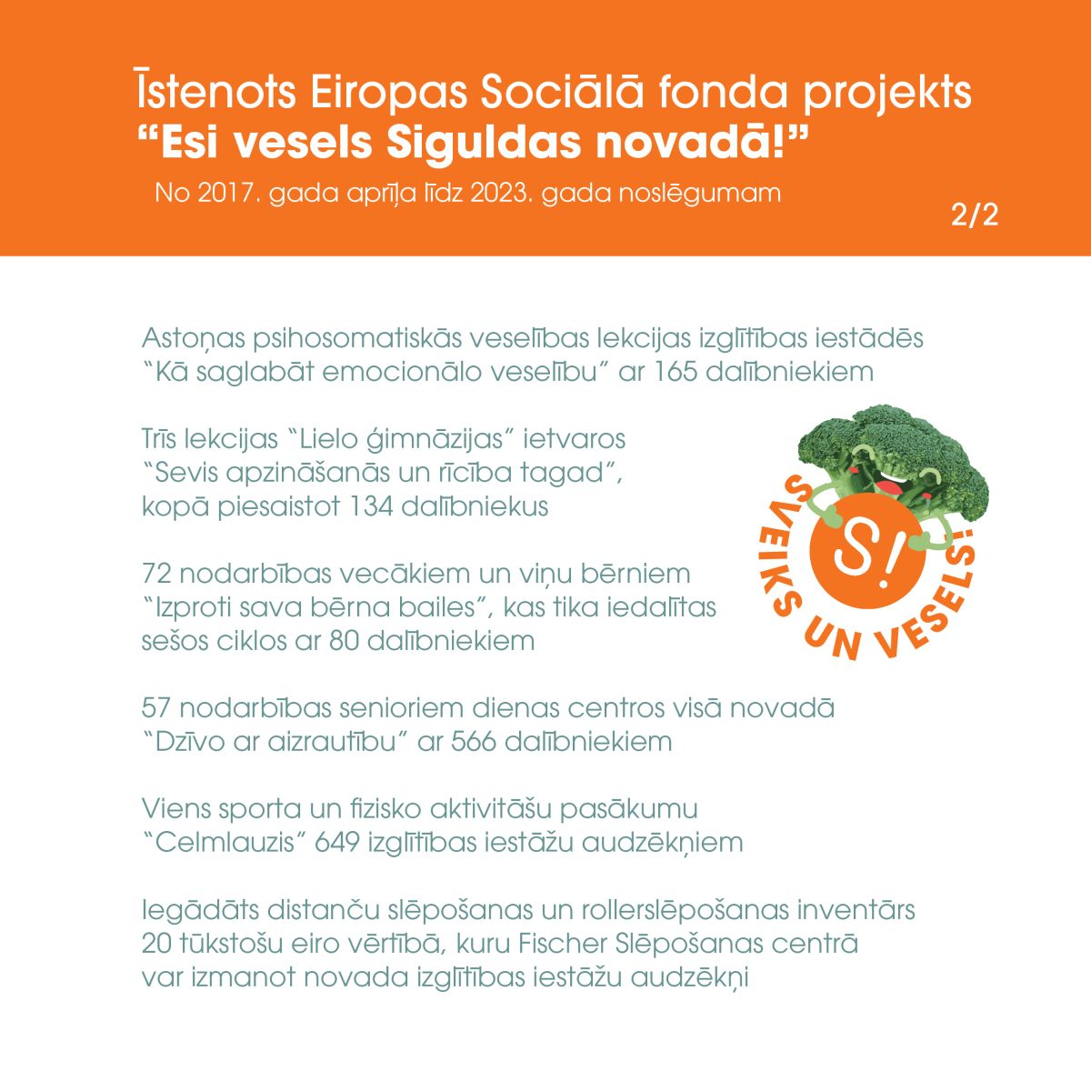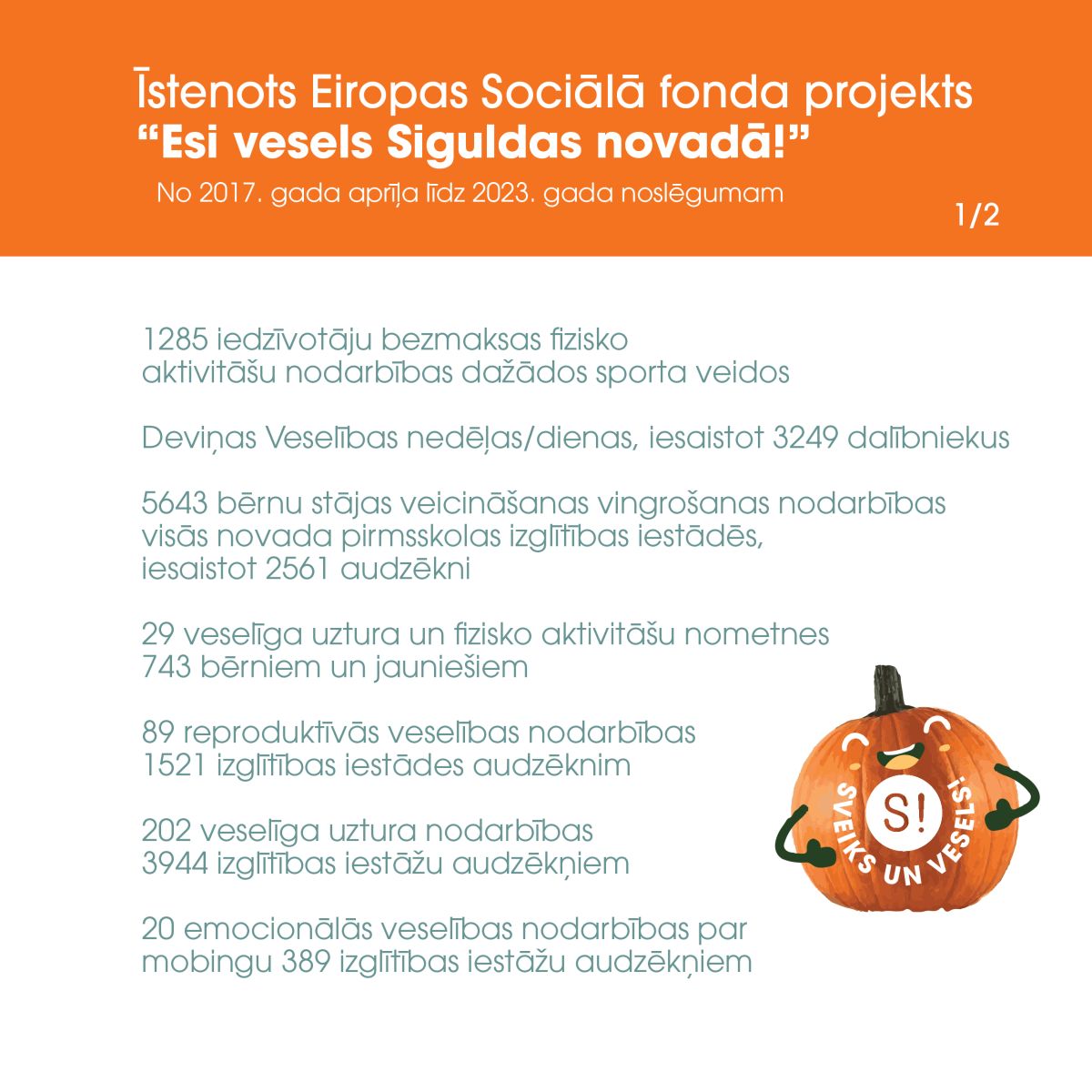 Sākot jau ar 2017. gada aprīļa līdz 2023. gada novembrim projekta ietvaros īstenotas 7418 dažādas veselīgu un aktīvu dzīvesveidu veicinošas aktivitātes plašam iedzīvotāju lokam, iesaistot tajās vairāk nekā 24 tūkstošus dalībniekus, no kuriem 61 % bija sievietes un 39 % vīrieši.