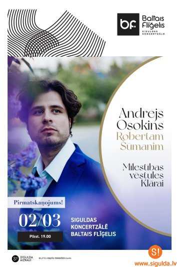 2. martā plkst. 19.00 Siguldas koncertzālē “Baltais flīģelis” grandiozs notikums – talantīgais, daudzpusīgais un pasaules klausītāju atzinību guvušais latviešu pianists Andrejs Osokins pirmatskaņos savu jaunāko programmu “Andrejs Osokins – Robertam Šūmanim. Mīlestības vēstules Klārai”.