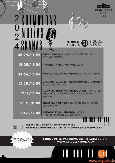 Šogad Krimuldas muižā ieplānoti vairāki koncerti, kuru laikā tiks spēlētas iemīļoti latviešu skaņdarbi un jauni muzikāli sacerējumi. Koncerti ar Siguldas novada pašvaldības atbalstu notiks aprīlī, maijā, jūnijā, septembrī, novembrī un decembrī. Krimuldas muižā paredzēta adventes vainagu meistarklase.