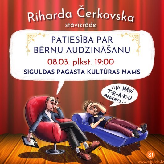 Piektdien, 8. martā, plkst. 19.00 uz Siguldas pagasta Kultūras nama skatuves viesosies Rihards Čerkovskis ar stāvizrādi “Patiesība par bērnu audzināšanu”.