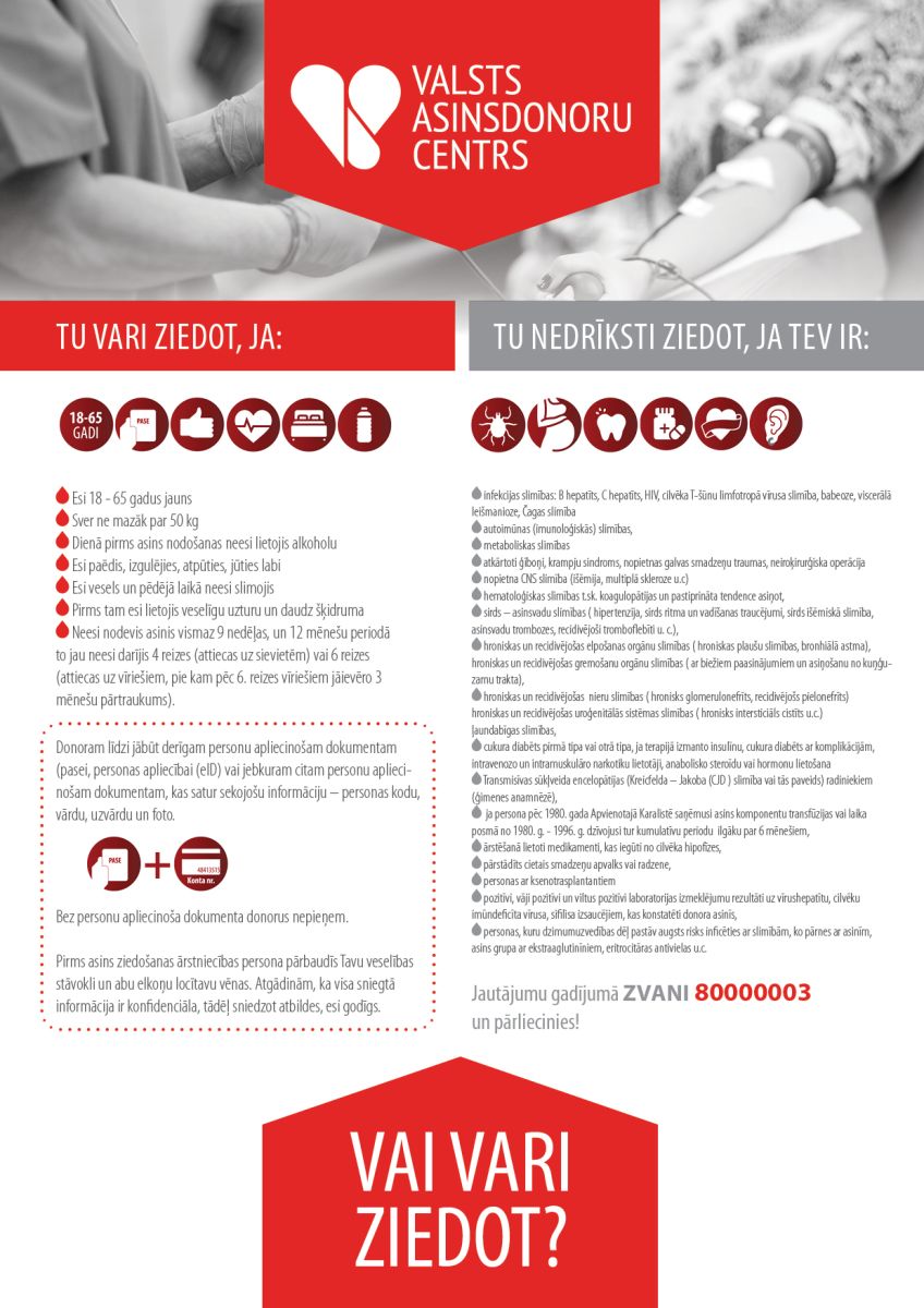 Atgādinām, ka par asins donoru var kļūt personas vecumā no 18 līdz 65 gadiem, kuru ķermeņa svars pārsniedz 50 kilogramus. Pirms asins ziedošanas donori aicināti pievērst uzmanību ēšanas paradumiem. Uzņemot nesabalansētu un taukvielām bagātu uzturu, asinīs nonāk palielināts tauku saturs, rezultātā šādas asinis nav iespējams izmantot pacientu ārstēšanai. Vismaz iepriekšējā dienā un dienā, kad ziedo asinis, ir jāēd bez pārmērībām. Nedrīkst uzturā lietot treknus un neveselīgus produktus. No ēdienreizes līdz asins ziedošanai ir jāpaiet vismaz trīs stundām. Pirms asins ziedošanas 24 stundu laikā jāuzņem daudz šķidruma: ūdeni, nesaldinātas augļu un dārzeņu sulas. Nedrīkst lietot enerģijas un alkoholiskos dzērienus. Asins nodošana nav vēlama pēc nakts maiņas, saspringta darba vai emocionāla pārdzīvojuma.