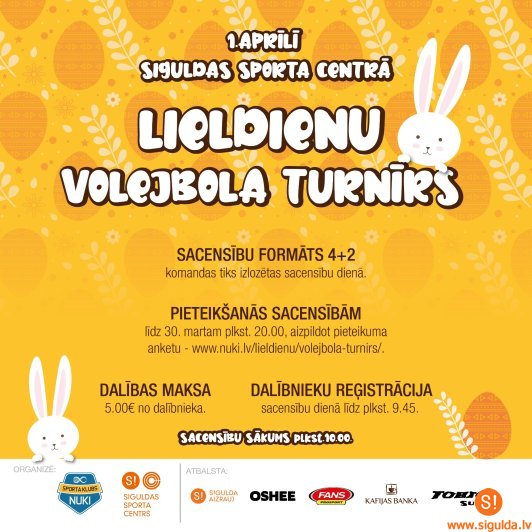 Otrajās Lieldienās, 1. aprīlī, Siguldas Sporta centrā norisināsies “Lieldienu volejbols turnīrs”. Ikviens entuziasts aicināts piedalīties tradicionālajā svētku volejbola turnīrā.
