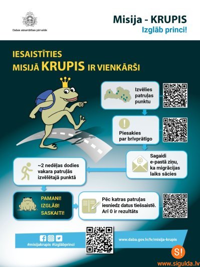 Ik pavasari līdz ar silto un lietaino laiku no ziemas guļas mostas lēnie krupji un mēro ierasto ceļu uz vienu un to pašu ūdenstilpi, lai vairotos. Diemžēl ceļa šķērsošana intensīvas satiksmes laikā krupim aizņem pat 15 minūtes, tādēļ Latvijā līdzīgi kā visā pasaulē ik pavasari tiek sabraukti tūkstošiem abinieku. Dabas aizsardzības pārvalde (pārvalde) jau trešo gadu īsteno kampaņu “Misija – KRUPIS. Izglāb princi!”. Misijas uzdevums ir kļūt par brīvprātīgo krupju glābēju un aktīvajā migrācijas laikā noteiktā ceļa posmā palīdzēt krupjiem droši šķērsot brauktuvi.