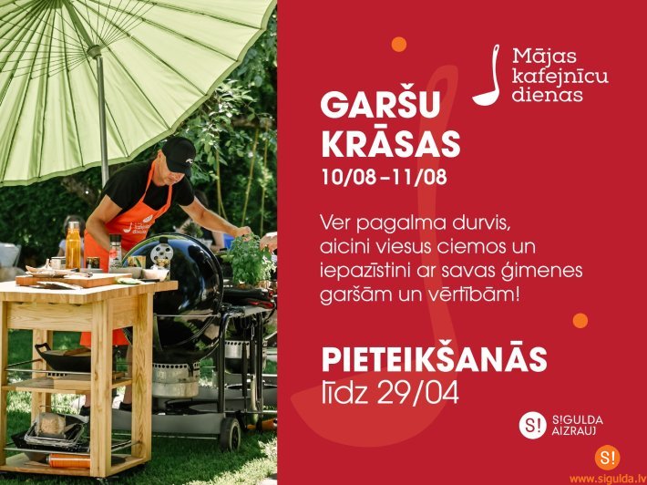 Siguldas novada Attīstības aģentūras Tūrisma nodaļa aicina pieteikties dalībai pasākumā “Mājas kafejnīcu dienas”, kas notiks 10. un 11. augustā. Pasākumā var piedalīties novada uzņēmēji, kā arī iedzīvotāji, kuri vēlas atvērt savas mājas vai saimniecības durvis un uzņemt viesus, cienājot ar saviem visu laiku iemīļotākajiem ēdieniem. Pieteikšanās norisinās līdz 29. aprīlim, aizpildot anketu tiešsaistē.