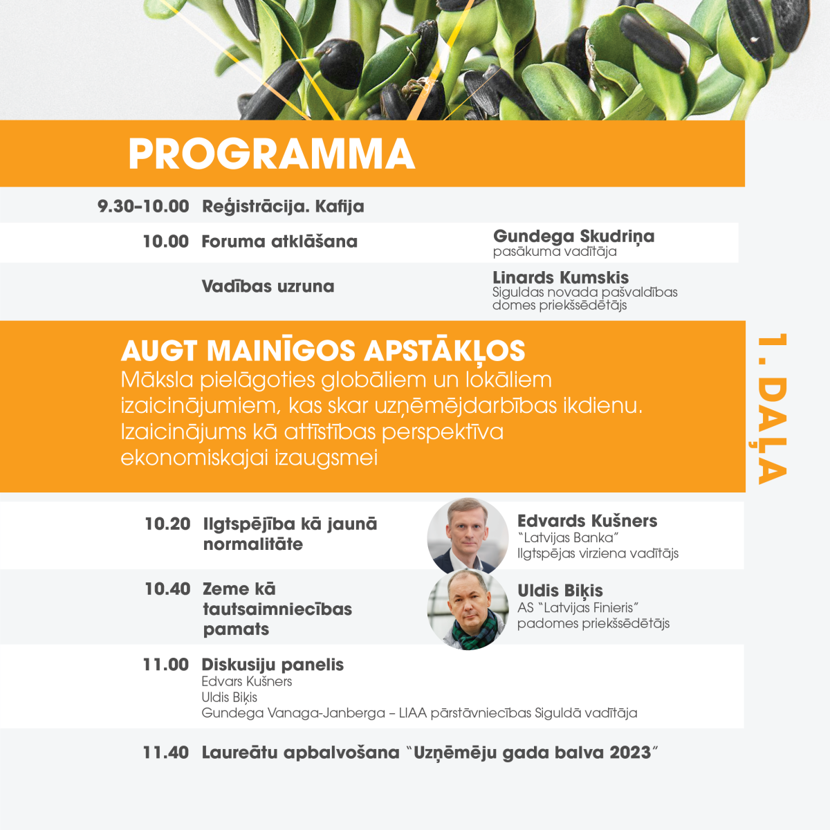 Foruma laikā tiks sveikti arī “Siguldas novada Uzņēmēju gada balvas 2023” laureāti, jau divpadsmito reizi godinot Siguldas novada uzņēmējus desmit dažādās nominācijās. Pretendentu pieteikšana notiek līdz 28. aprīlim, aizpildot anketu elektroniski e.sigulda.lv. Anketa pieejama arī papīra formātā visos pašvaldības klientu apkalpošanas centros. Balsojumā var piedalīties Siguldas novadā deklarētas personas no 18 gadu vecuma.