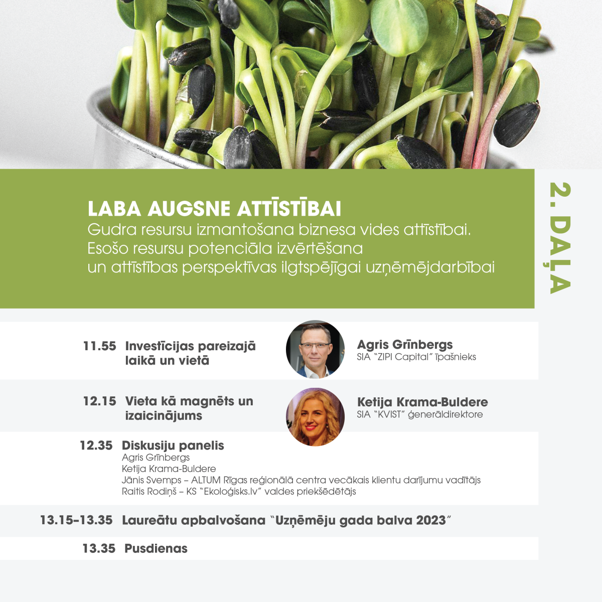 - “Laba augsne attīstībai” – gudra resursu izmantošana biznesa vides attīstībai. Esošo resursu potenciāla izvērtēšana un attīstības perspektīvas ilgtspējīgai uzņēmējdarbībai;