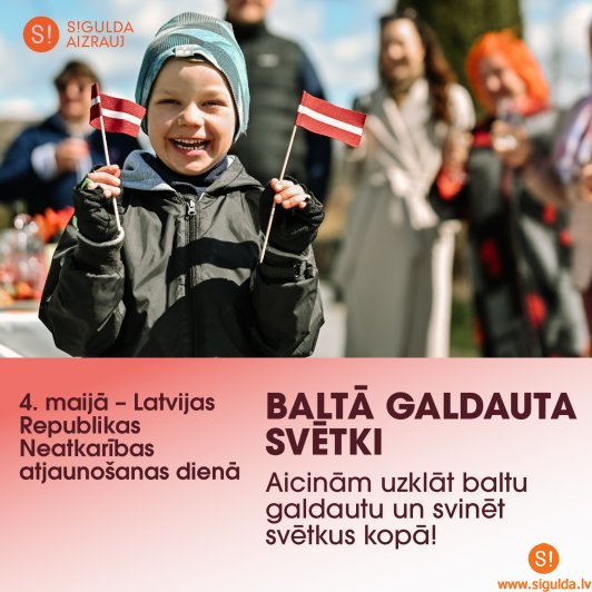Latvijas Republikas Neatkarības atjaunošanas dienā, 4. maijā, aicinām ikvienu savā kopienā, ģimenē, pagalmā, draugu lokā vai darbavietā svinēt Baltā galdauta svētkus. Uzklāsim baltus galdautus un svinēsim mūsu brīvību. Svinību norises vietas lūgums pieteikt līdz 22. aprīlim, rakstot uz e-pasta adresi dace.plesa@sigulda.lv.