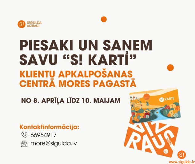 Gādājot par pakalpojumu pieejamību teritoriāli plašākam novadnieku pulkam, klientu apkalpošanas centrā Morē vēl līdz 10. maijam var pieteikties un saņemt Siguldas novada ID karti (“S! Karti”).