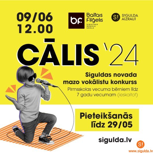 9. jūnijā plkst. 12.00 Siguldas koncertzālē “Baltais flīģelis” notiks mazo vokālistu konkurss “Cālis 2024”, kurā aicināti piedalīties pirmsskolas vecuma bērni no visa Siguldas novada  līdz septiņu gadu vecumam (ieskaitot).
