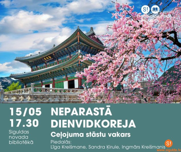 Trešdien, 15. maijā, plkst. 17.30 Siguldas novada bibliotēka ikvienu ceļot mīļotāju aicina uz ceļojuma stāstu vakaru “Neparastā Dienvidkoreja”. Ar saviem stāstiem bibliotēkā viesosies siguldieši – Līga Kreišmane, Sandra Ķirule un Ingmārs Kreišmanis.
