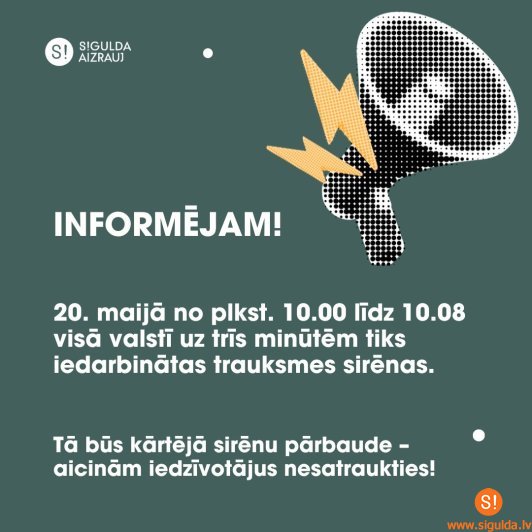 Pirmdien, 20. maijā no plkst. 10.00 līdz 10.08 visā valstī uz trīs minūtēm tiks iedarbinātas trauksmes sirēnas, lai pārbaudītu valsts agrīnās brīdināšanas sistēmas ieslēgšanas kārtību un tās darbību, kā arī, lai konstatētu bojājumus vai traucējumus trauksmes sirēnu darbībā un to skaņas signāla dzirdamībā. Trauksmes sirēnu pārbaudes laikā trīs minūšu ilgumā skanēs viļņveida signāls, kas nozīmē, ka skaņas signāls skanēs piecas sekundes, tam sekos pārtraukums, un turpināsies atkārtots piecu sekunžu skaņas signāls un pārtraukums. Iepriekš tika pārraidīts cita veida skaņas signāls.