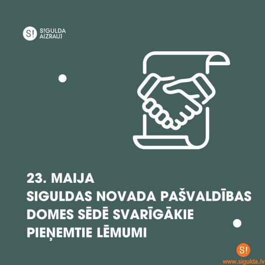 Ceturtdien, 23. maijā, norisinājās Siguldas novada pašvaldības domes sēde, kurā izskatīti 63 lēmumprojekti; būtiskākie no pieņemtajiem lēmumiem apkopoti šajā rakstā. Plašāka informācija par sēdes norisi un lēmumiem pieejama pašvaldības tīmekļa vietnes sadaļā “Domes sēdes”.