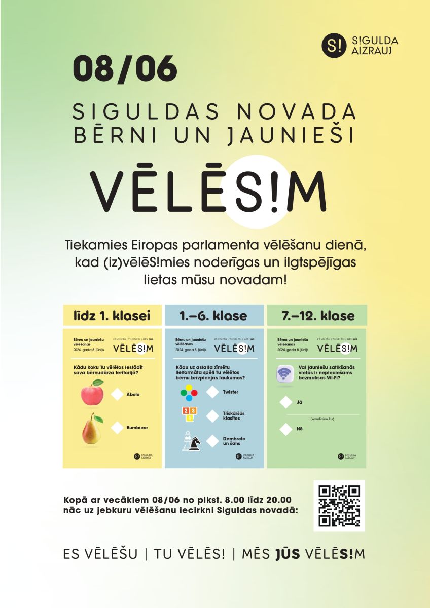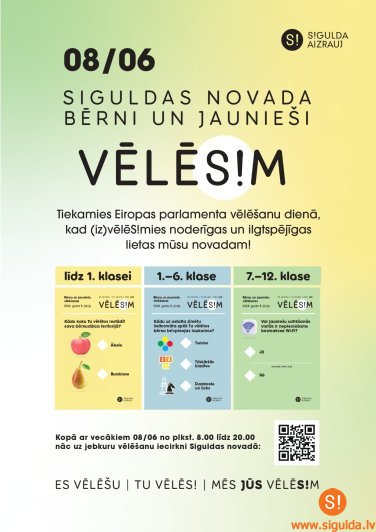 Veicinot jaunās paaudzes interesi par vēlēšanām un demokrātisku lēmumu pieņemšanu, ar moto “Es vēlēšu, Tu vēlēS!, Mēs jūs vēlēS!m” 8. jūnijā, Eiropas Parlamenta vēlēšanu dienā, Siguldas novads īstenos vēlēšanas bērniem un jauniešiem. Viņiem šajā dienā būs tiesības izvēlēties noderīgas un ilgtspējīgas lietas Siguldas novadam.
