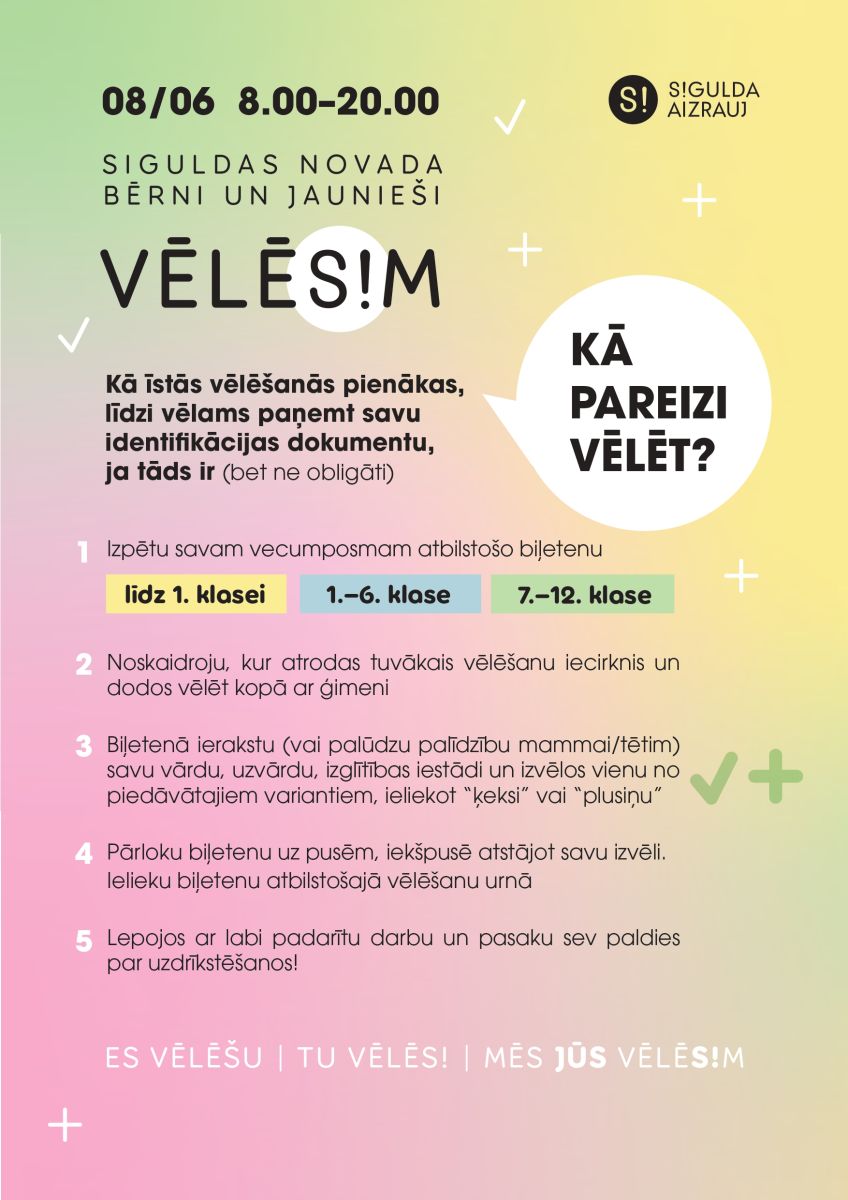 Jau šajā nedēļas nogalē, 8. jūnijā, Eiropas Parlamenta vēlēšanu dienā, Siguldas novads īstenos vēlēšanas bērniem un jauniešiem “Es vēlēšu, Tu vēlēS!, Mēs jūs vēlēS!m”. Viņiem šajā dienā būs tiesības izvēlēties noderīgas un ilgtspējīgas lietas Siguldas novadam.