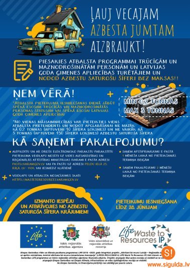 Vides aizsardzības un reģionālās attīstības ministrija (VARAM) informē, ka kampaņas “Ļauj vecajam azbesta jumtam aizbraukt!” laikā iespēja nodot azbestu saturošo šīferi bez maksas ir ne tikai trūcīgām un maznodrošinātām personām, bet arī Latvijas Goda ģimenes apliecības “Goda ģimene” turētājiem.