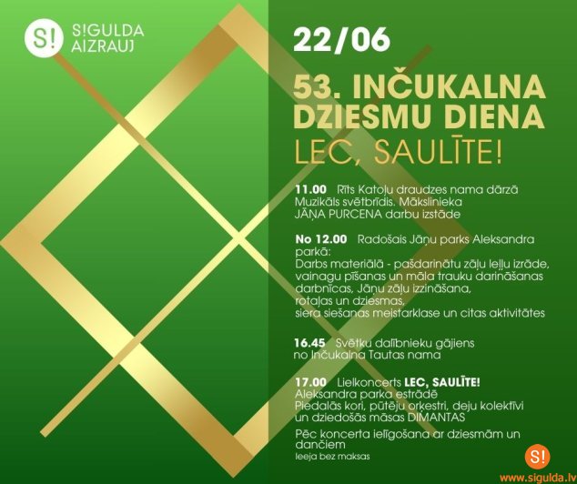 Plkst. 17.00 gaidāms 53. Inčukalna Dziesmu dienas lielkoncerts “Lec, saulīte!” Aleksandra parka estrādē. Koncertā piedalīsies Inčukalna Tautas nama jauktā kora “Mežābele” draugu kori: Siguldas novada Kultūras centra jauktais koris “Spārni”, Rīgas pilsētas VEF Kultūras pils jauktais koris “Senrīga”, Rīgas Kultūras un tautas mākslas centra “Ritums” kamerkoris “Vidus”, Latvijas Zinātņu akadēmijas jauktais koris “Gaismaspils”, Latvijas Arodbiedrību kluba “Vecrīga” jauktais koris “Rīdzene”, Ropažu novada Ropažu Kultūras nama jauktais koris “Ropaži”, Ropažu novada Zaķumuižas jauktais koris “Ozolzīle”, Siguldas novada Inčukalna Tautas nama senioru koris “Atblāzma” un kultūras centra “Siguldas devons” senioru koris “Gāle”, kā arī pūtēju orķestri: Inčukalna Tautas nama un skolu apvienotais pūtēju orķestris un Siguldas Jauniešu pūtēju orķestris “Sudrabskaņa”. Koncertā piedalīsies arī Inčukalna Tautas nama deju kolektīvi: vidējās paaudzes deju kolektīvs “Virši” un senioru deju kolektīvs “Labāko gadu Virši”.