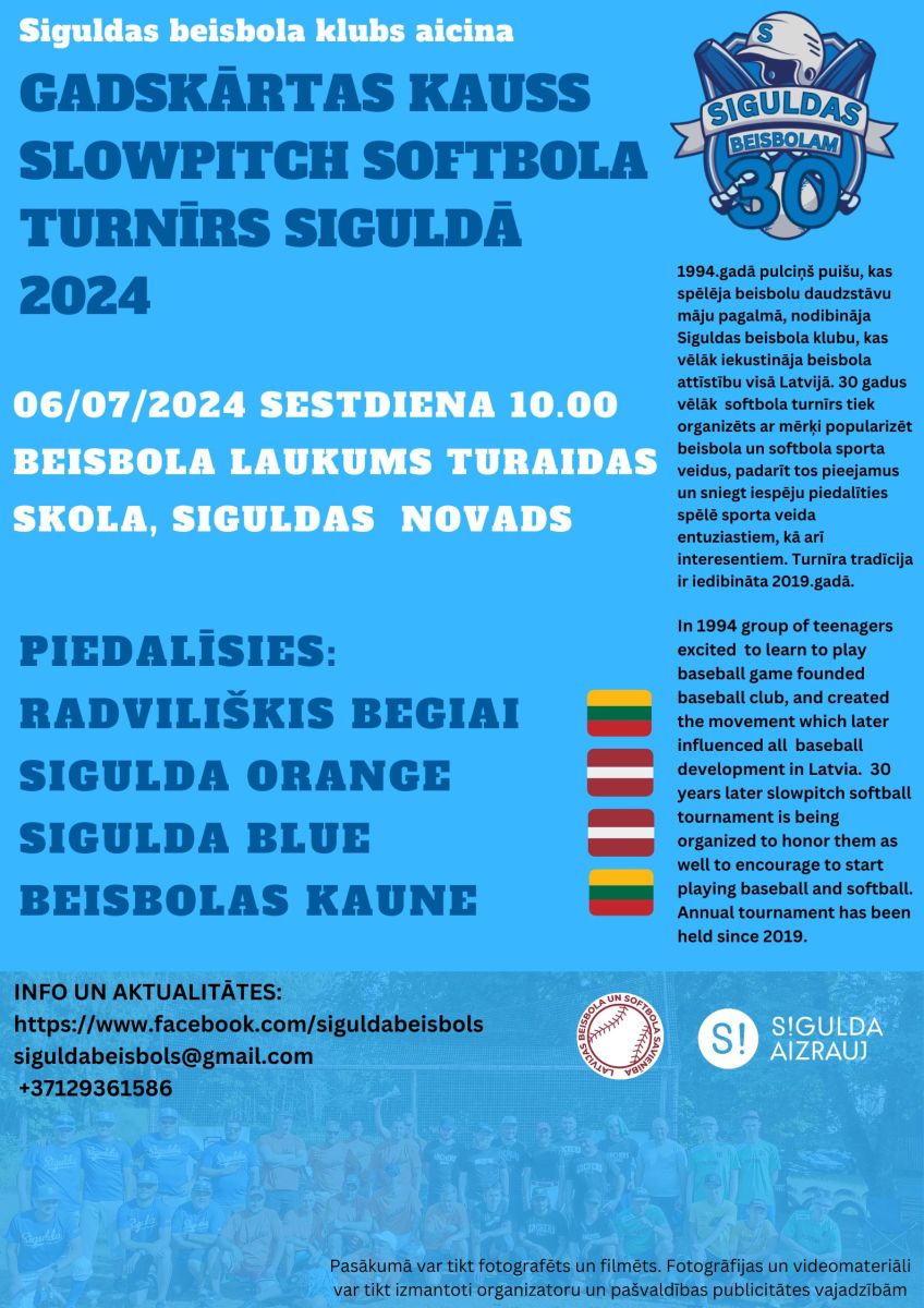 6. jūlijā plkst. 10.00 Turaidas sporta laukumā notiks slowpitch softbola turnīrs “Gadskārtas kauss 2024”. Šoreiz Siguldas novadā viesosies divas komandas no Lietuvas, bet mājiniekus pārstāvēs divas Siguldas komandas. Šis būs jau sestais slowpitch turnīrs Siguldā, un īpašs ar to, ka ir vienīgais tradicionālais softbola turnīrs Latvijā. Vēl īpašu šo turnīru padara tas, ka Siguldas beisbola klubs šogad svin savu trīsdesmitgadi.