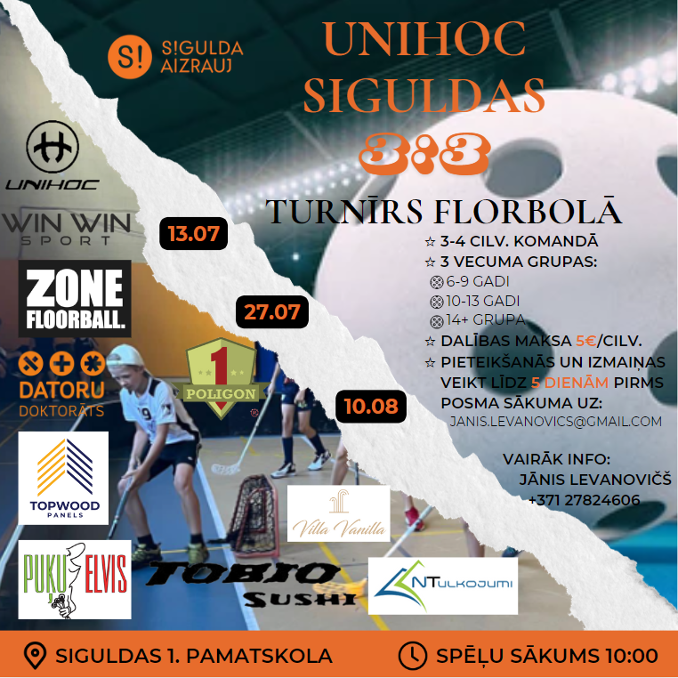 13. jūlijā Siguldas 1. pamatskolas sporta zālē notiks 3:3 florbola pirmais posms. Turnīra sākums gaidāms plkst. 10.00.
