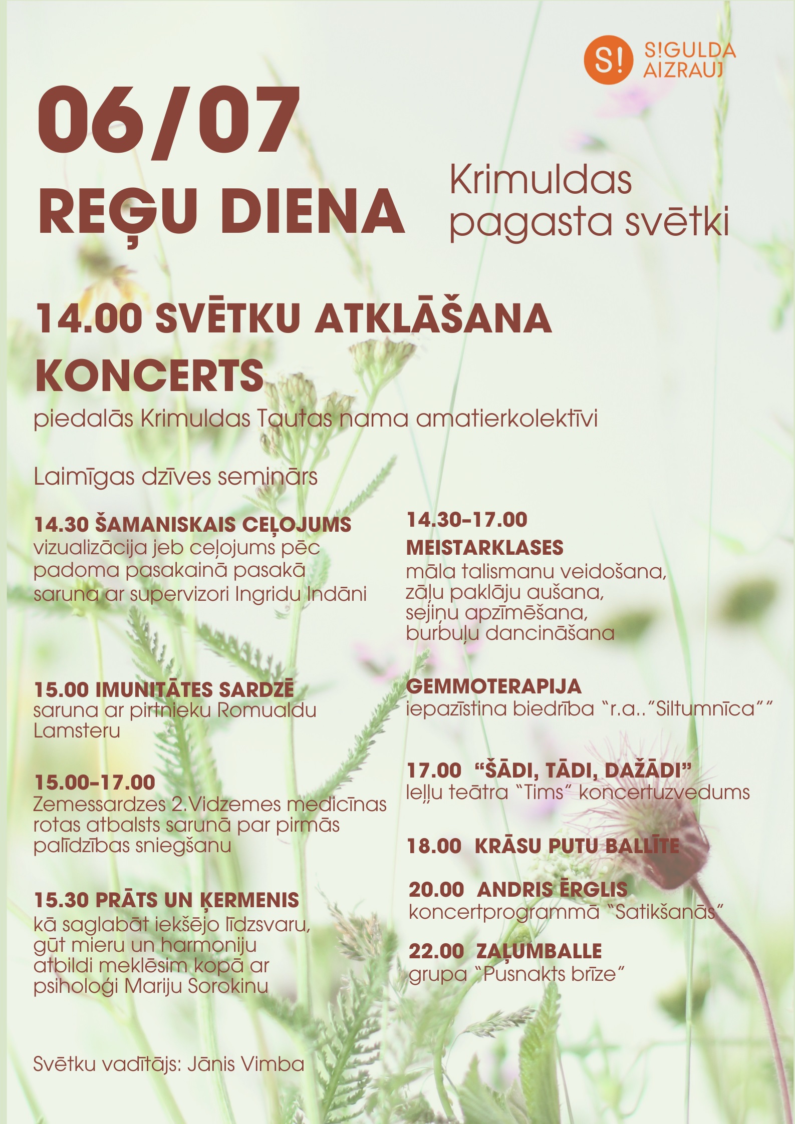 Svētkus caurvij tematika “Laimīgas dzīves seminārs”. Pasākuma laikā savos pieredzes stāstos un zināšanās praktiskajās nodarbībās dalīsies supervizore Ingrida Indāne, psiholoģe Marija Sorokina, pirtnieks Romualds Lamsters, Zemessardzes 2. Vidzemes Medicīnas rotas speciālisti un Krimuldas Brīvprātīgo ugunsdzēsēju brigāde. Mazajiem svētku dalībniekiem būs iespēja līdzdarboties vairākās radošajās darbnīcās, iepazīties ar pirmo pastaigu maršrutu Raganā “Es Tev parādīšu, kas mums te interesants”, ko veidoja pirmsskolas izglītības iestādes “Krimulda” audzēkņi, kā arī noskatīties koncertuzvedumu “Šādi, tādi, dažādi” un izbaudīt putu ballītes priekus.