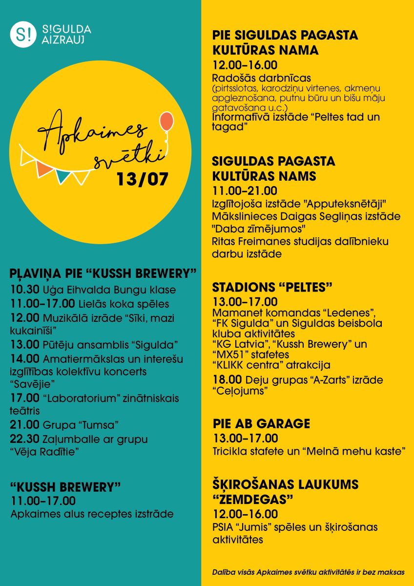 Visas dienas garumā pasākuma apmeklētājus sagaida dažādi notikumi. Pļaviņā pie “Kussh Brewery” dienu plkst. 10.30 ierībinās Uģa Eihvalda bungu klases priekšnesumi. Plkst. 12.00 izrāde bērniem “Sīki, mazi kukainīši”. Plkst. 13.00 pūtēju ansambļa “Sigulda” koncerts, bet plkst. 14.00 amatiermākslas un interešu izglītības kolektīvu un vietējo talantu koncerts “Savējie”. Koncertā piedalās “Sandas radošā studija”, eksotisko deju studija “Soul Sisters”, senioru deju kopa “Preilene”, Matīsa Liepas deju studija, sporta deju klubs “Zīle”, Siguldas pagasta Kultūras nama pūtēju orķestris, kā arī vietējie talanti – dziedātāji Amanda Brauere un Zemguss. Plkst. 16.00 sieviešu vokālā ansambļa “Si” koncerts, bet plkst. 17.00 “Laboratorium” zinātniskais teātris. No plkst. 11.00 līdz 17.00 aicinām izmēģināt veiksmi, spēlējot lielās koka spēles.