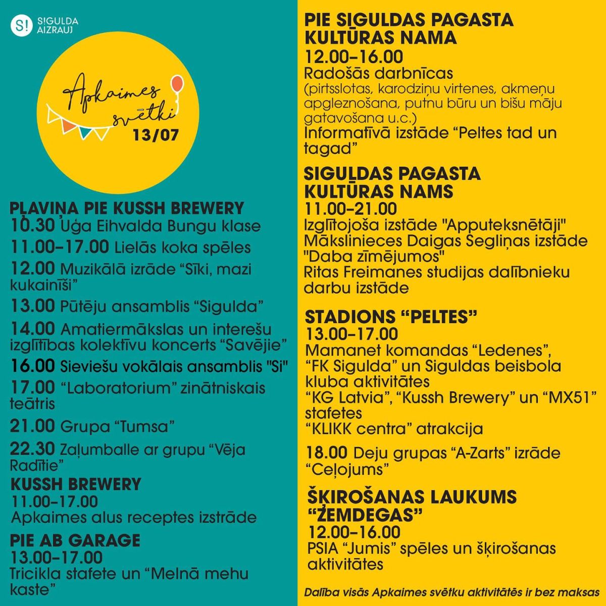 Visas dienas garumā pasākuma apmeklētājus sagaida dažādi notikumi. Pļaviņā pie “Kussh Brewery” dienu plkst. 10.30 ierībinās Uģa Eihvalda bungu klases priekšnesumi. Plkst. 12.00 izrāde bērniem “Sīki, mazi kukainīši”. Plkst. 13.00 pūtēju ansambļa “Sigulda” koncerts, bet plkst. 14.00 amatiermākslas un interešu izglītības kolektīvu un vietējo talantu koncerts “Savējie”. Koncertā piedalās “Sandas radošā studija”, eksotisko deju studija “Soul Sisters”, senioru deju kopa “Preilene”, Matīsa Liepas deju studija, sporta deju klubs “Zīle”, Siguldas pagasta Kultūras nama pūtēju orķestris, kā arī vietējie talanti – dziedātāji Amanda Brauere un Zemguss. Plkst. 16.00 sieviešu vokālā ansambļa “Si” koncerts, bet plkst. 17.00 “Laboratorium” zinātniskais teātris. No plkst. 11.00 līdz 17.00 aicinām izmēģināt veiksmi, spēlējot lielās koka spēles.