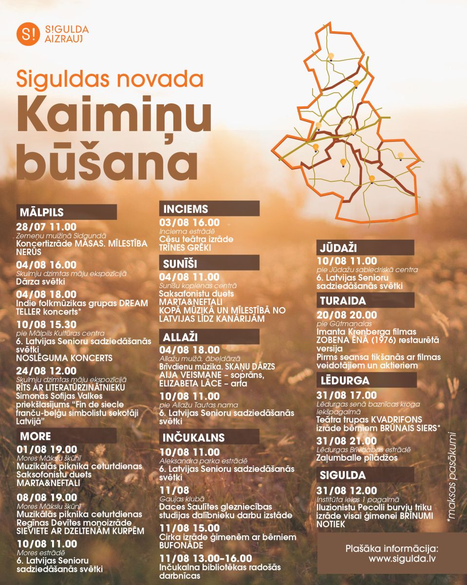 Visu aizsāksim ar koncertizrādi “Māsas. Mīlestība nerūs” 28. jūlijā plkst. 11.00 Mālpilī, Sidgundas Zemeņu muižiņā. Mālpilī pasākumi turpināsies visu augustu – 4. augustā Skulmju dzimtas māju ekspozīcijā plkst. 16.00 tiks svinēti Dārza svētki, bet vakara turpinājumā plkst. 18.00 notiks indie folkmūzikas grupas “Dream Teller” koncerts. Biļetes cena koncertam – 10 eiro, iepriekšpārdošanā ar “S! Karti” – 8 eiro. 10. augustā plkst. 15.30 pie Mālpils Kultūras centra uz 6. Latvijas Senioru sadziedāšanās svētku noslēguma koncertu pulcēsies 850 svētku dalībnieki. 24. augustā plkst. 12.00 Skulmju dzimtas māju ekspozīcijā notiks cikla “Rīts ar literatūrzinātnieku” Simonas Sofijas Valkes priekšlasījums “Fin de siecle franču-beļģu simbolistu sekotāji Latvijā”.