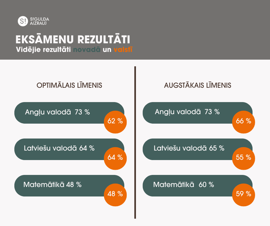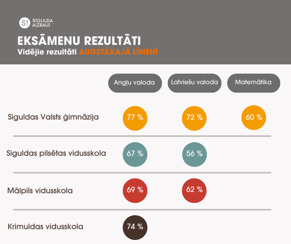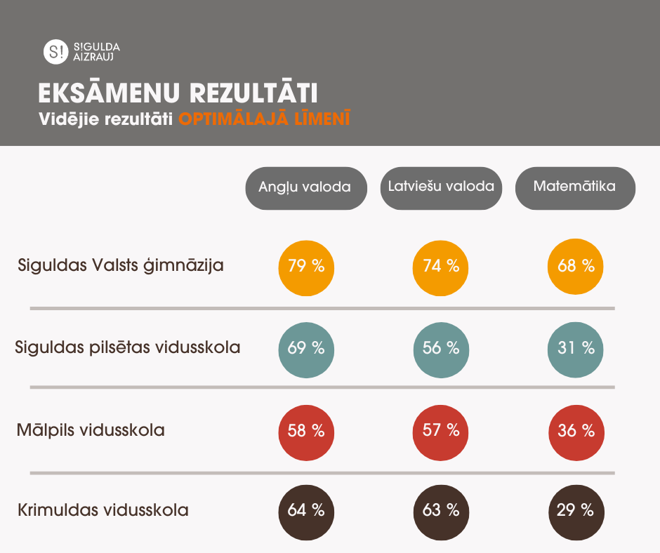 CE optimālajā līmenī kārtoja visās četrās vidējās izglītības iestādēs. Optimālajā līmenī angļu valodas CE vidējais vērtējums ir 73 % (valstī 62 %), latviešu valodas CE vidējais vērtējums ir 64 % (valstī 55 %), matemātikas CE vidējais vērtējums – 48 % (valstī 34 %). Tikmēr augstākajā līmenī angļu valodas CE vidējais vērtējums ir 73 % (valstī 66 %), latviešu valodā un literatūrā CE vidējais vērtējums ir 65 % (valstī 55 %). Matemātikas CE augstākajā līmenī kārtoja tikai Siguldas Valsts ģimnāzijā, uzrādot vidējo vērtējumu – 60 % (valstī 59 %).