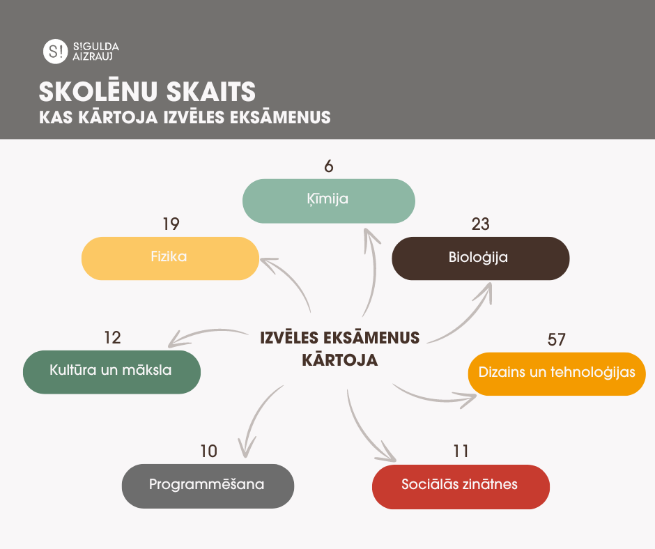 - dizainā un tehnoloģijās (57 skolēni, no kuriem 30 audzēkņi no Siguldas pilsētas vidusskolās, 14 – no Siguldas Valsts ģimnāzijas, deviņi – no Krimuldas vidusskolas un četri – no Mālpils vidusskolas);